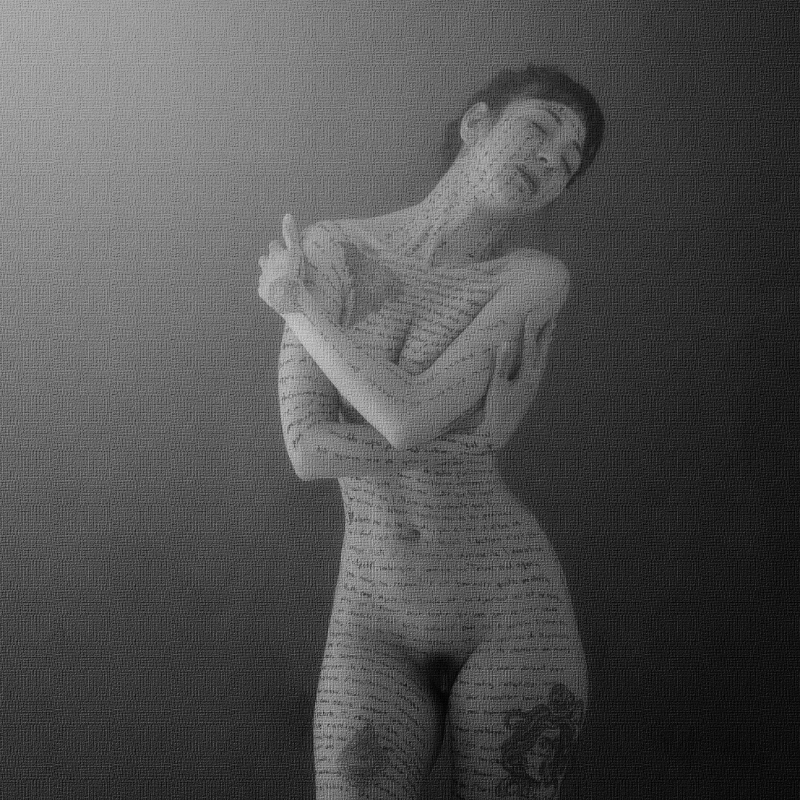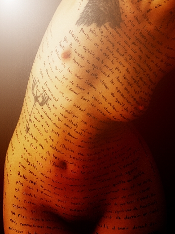 Celui qui ignore la puissance des mots se condamne à être leur prisonnier.Comme une armure, un baume, une incantation, les mots à même la peau. Dans la série « les écritures », Sadinoel s’interroge ,ouvre la un questionnement et une étude sur le corps verbeux, sur son action médiatrice entre les êtres humains, mais également entre les signes et leur transmission. Sadinoel explore les liens qui unissent depuis des millénaires l’écriture et les sens.Les écrits, par la matière utilisée et la transpiration du corps, demeurent éphémères bousculant ainsi l’adage, les paroles s’envolent et les écrits restent.